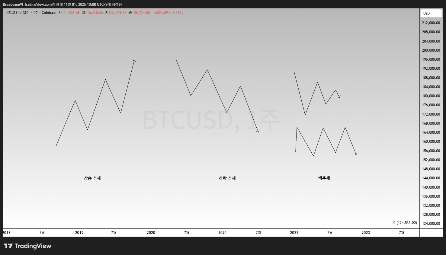 예를 들어 비트코인을 일봉으로 보면 추세가 애매하게 보이지만,